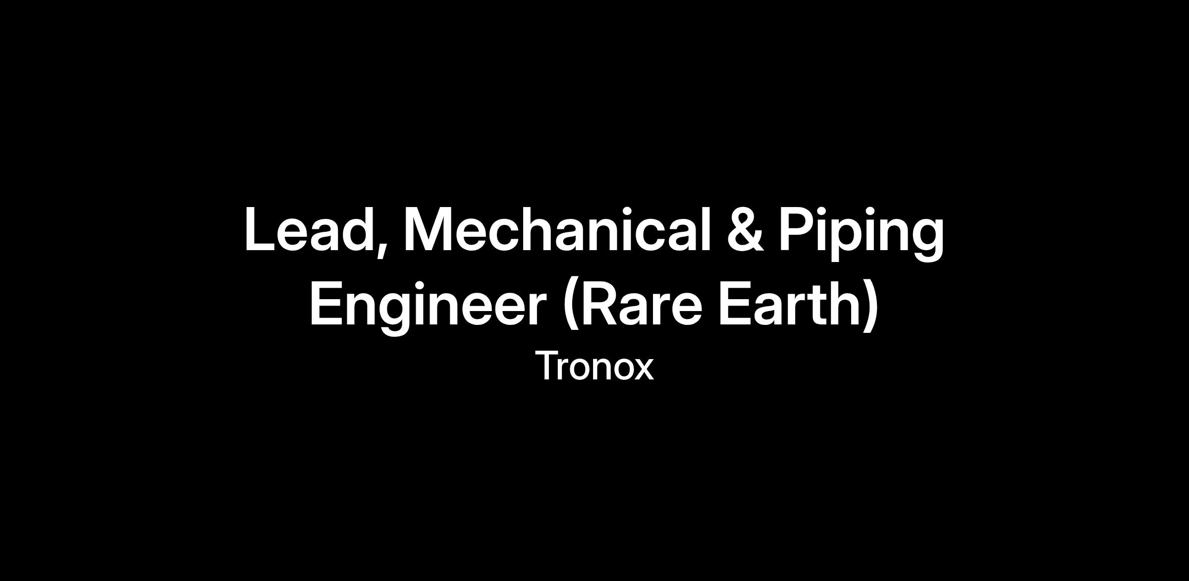 Tronox is seeking a technically strong and delivery-focused Lead Mechanical & Piping Engineer to lead the mechanical and piping engineering scope across both the Definitive Feasibility Study (DFS) and Execution phases of a major Rare Earths project in Western Australia.
