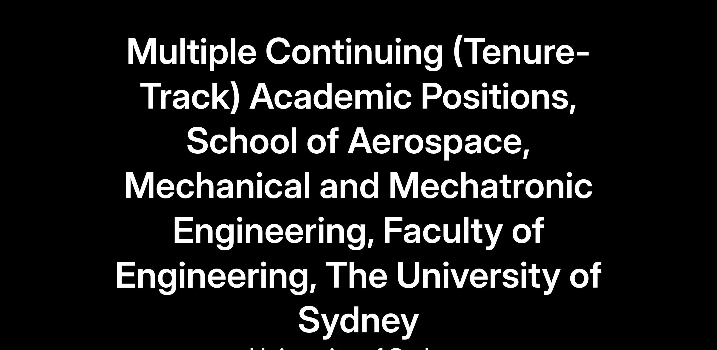 The School of Aerospace, Mechanical and Mechatronic Engineering at The University of Sydney (Sydney, Australia) invites applications for several academic positions at all levels with demonstrable strong research experience in, but not limited to, the following areas: